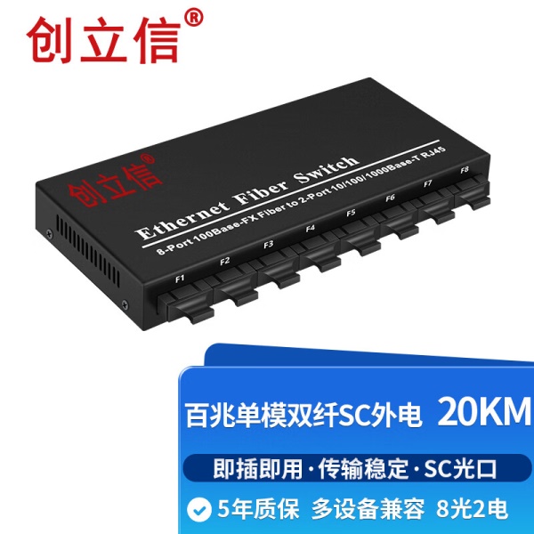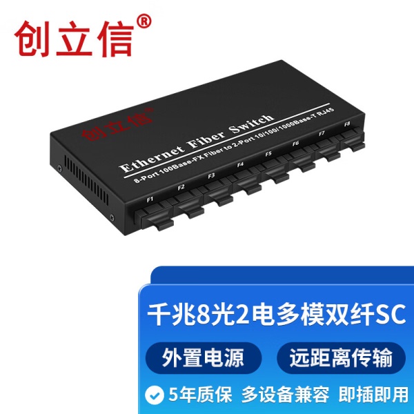 创立信 光纤收发器 光电转换器 网络光端机 百兆8光2电单模双纤SC外电20KM 1台
