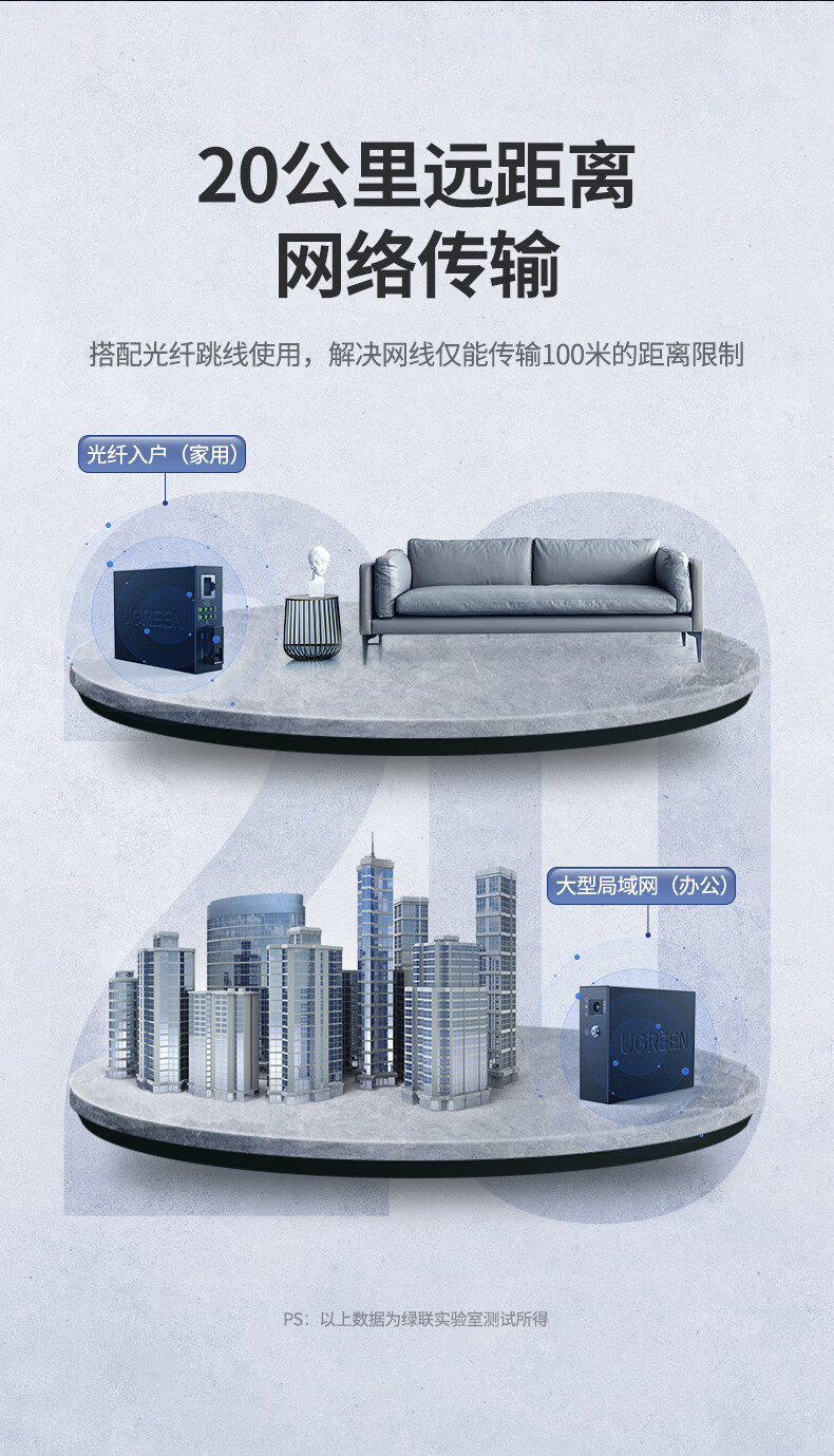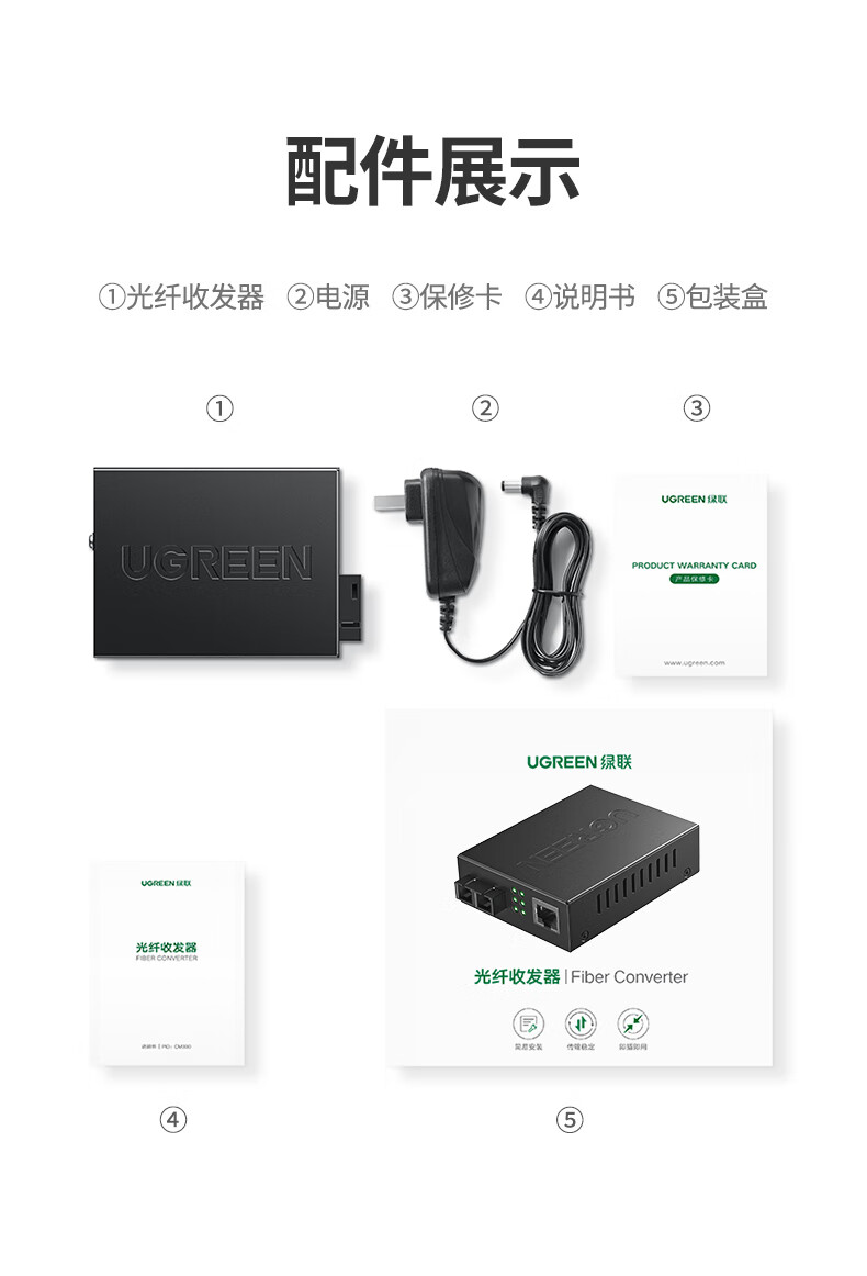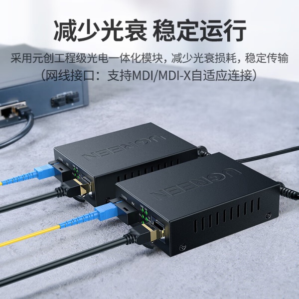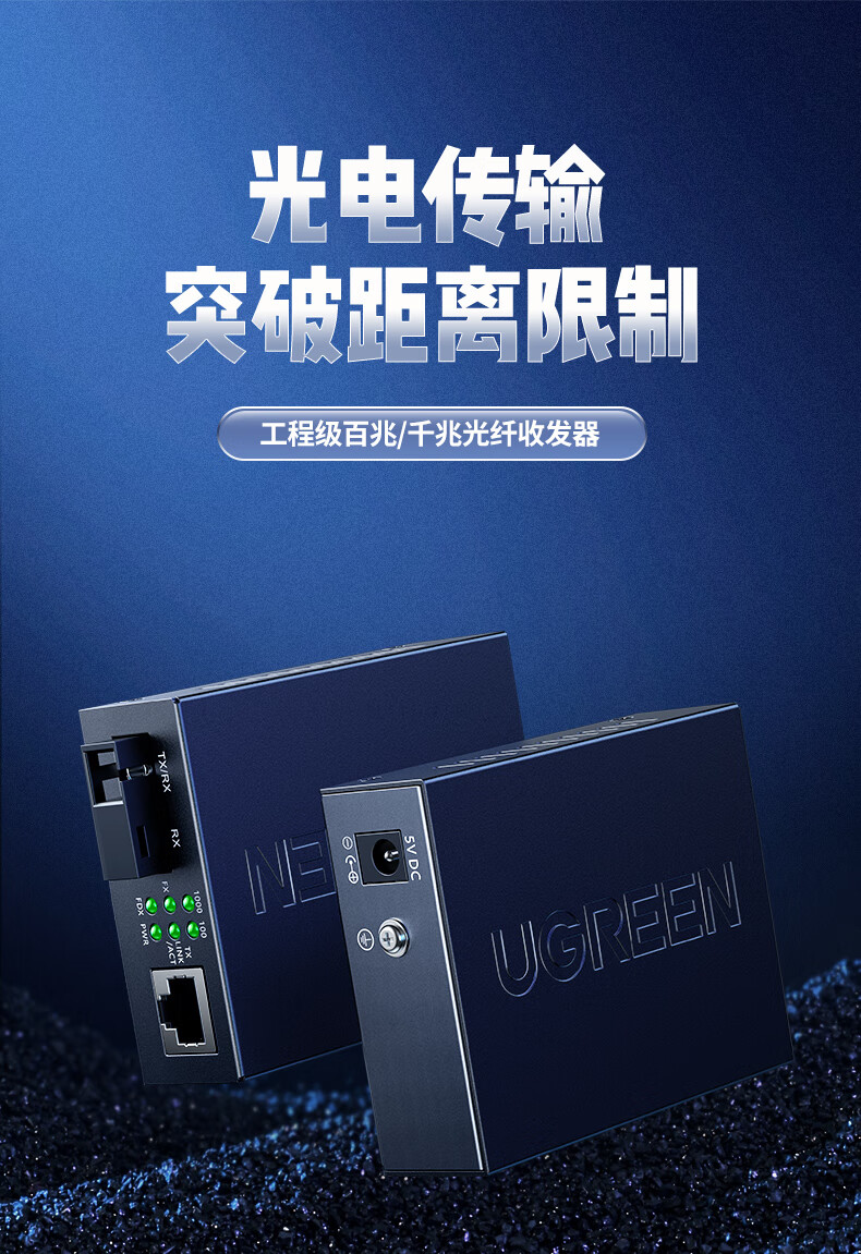 绿联(UGREEN)百兆单模双纤光纤收发器 光电转换器 SC接口电信级远距离网络传输器 单只装 0-20KM