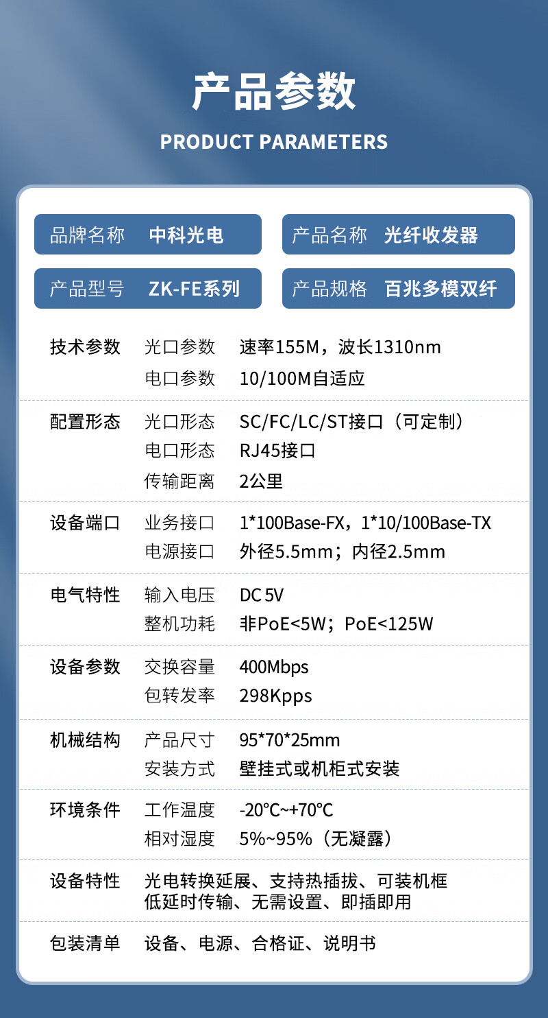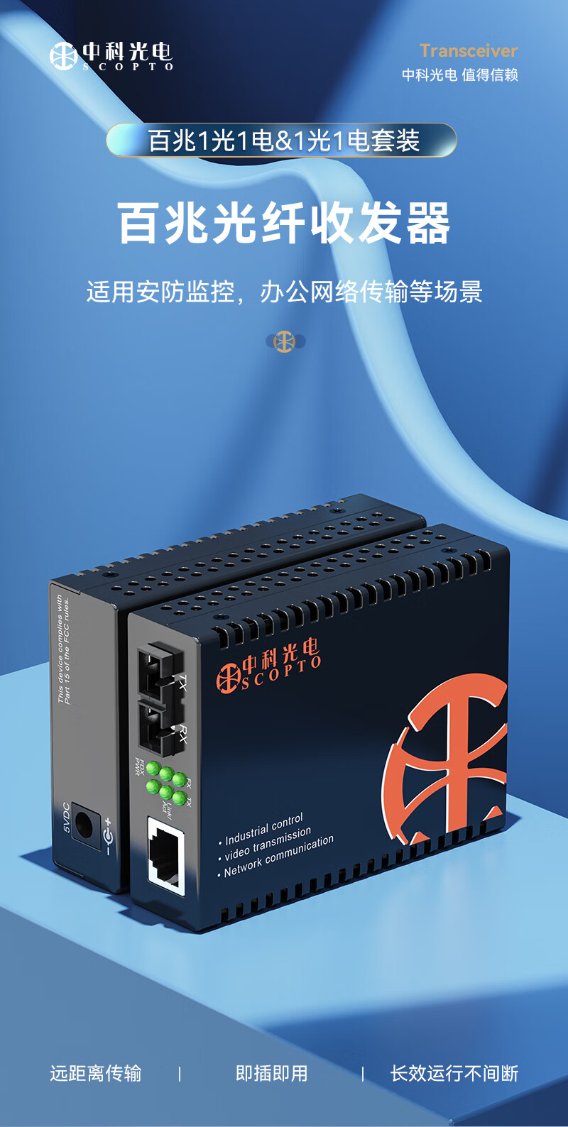 中科光电 百兆多模光纤收发器 多模光电转换器多模双纤 电信级 外置电源 SC接口 2公里